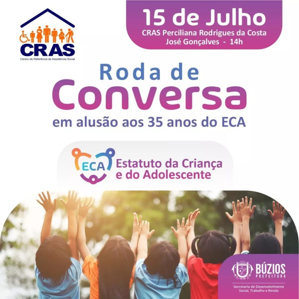 A Prefeitura de Búzios, por meio da Secretaria de Desenvolvimento Social, Trabalho e Renda, promoverá, no dia 15 de julho, às 14h, uma roda de conversa em alusão aos 35 anos do Estatuto da Criança e do Adolescente (ECA). O encontro acontecerá no CRAS Perciliana Rodrigues da Costa, no bairro José Gonçalves, e será aberto ao público.
