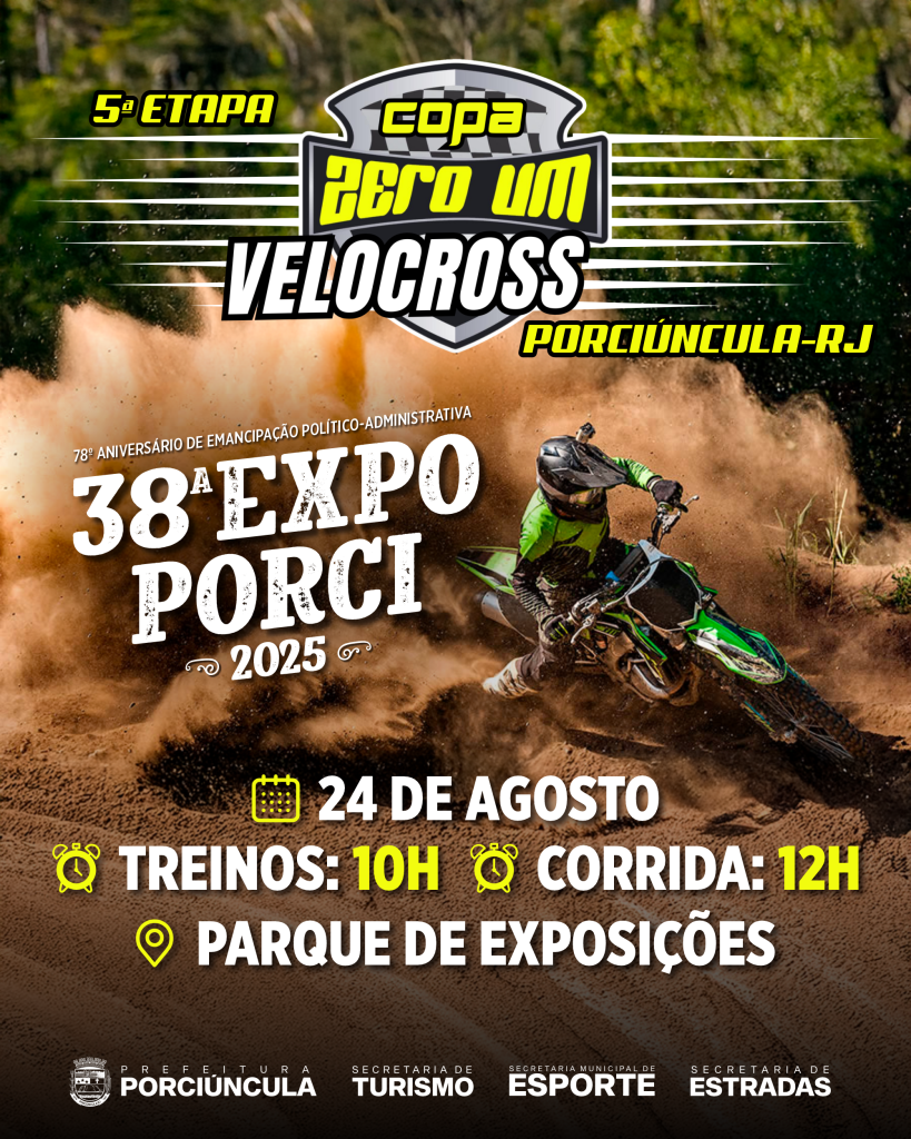 No próximo dia 24 de agosto, Porciúncula será palco da 5ª Etapa da Copa Zero Um de Velocross, trazendo muita emoção e velocidade para o Parque de Exposições José D’Abreu Salgado.