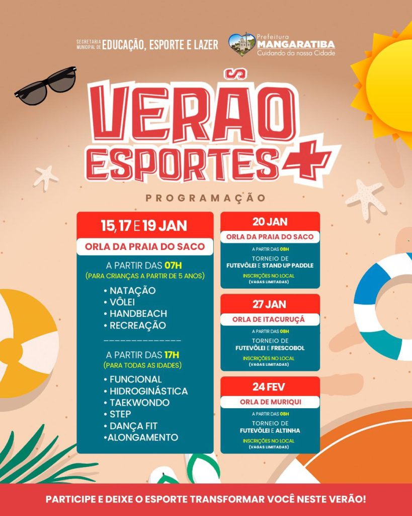 O projeto ‘Verão Esportes +’, da Secretaria de Educação, Esporte e Lazer de Mangaratiba, começa na próxima segunda-feira, dia 15, e vai levar diversas atividades esportivas gratuitas para a orla da Praia do Saco. Mas, além da programação semanal, voltada para pessoas de todas as idades, a iniciativa também vai promover torneios esportivos em outros pontos da cidade. As competições de futevôlei, frescobol e altinha, vão acontecer nos dias 20 e 27/01 e 24/02. Confira a programação completa abaixo e não deixe de participar!