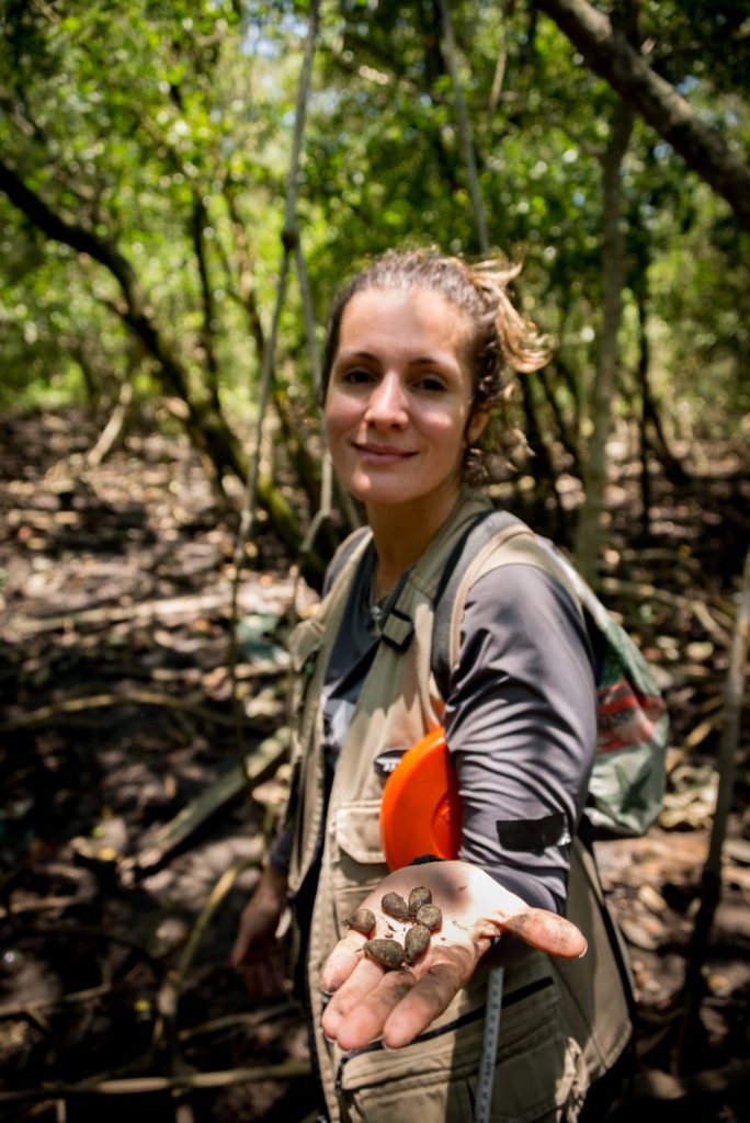 Filha da Baía de Guanabara, nascida e criada na Ilha de Itaoca, em São Gonçalo, iniciou no ativismo ambiental como integrante do primeiro ecoclube da ONG Guardiões do Mar. Desde então, vem trilhando um percurso que une ciência, território e participação social. Atua como pesquisadora do Projeto Lagoas Vivas e como responsável técnica da ONG Guardiões do Mar, desenvolvendo pesquisas em ecologia de manguezais, restauração de áreas costeiras degradadas, educação ambiental e nas interações entre organismos marinhos e os parâmetros físico-químicos dos ecossistemas costeiros. Contribui com ações de restauração ecológica no território do Quilombo do Feital, onde participou do levantamento territorial em apoio à luta pela demarcação. Esse trabalho acontece com a comunidade, sempre com respeito às memórias, às vozes e à resistência que sustentam esse chão. “Acredito que não existe ciência sem território, nem conservação ambiental sem justiça social”, comenta Carolina.