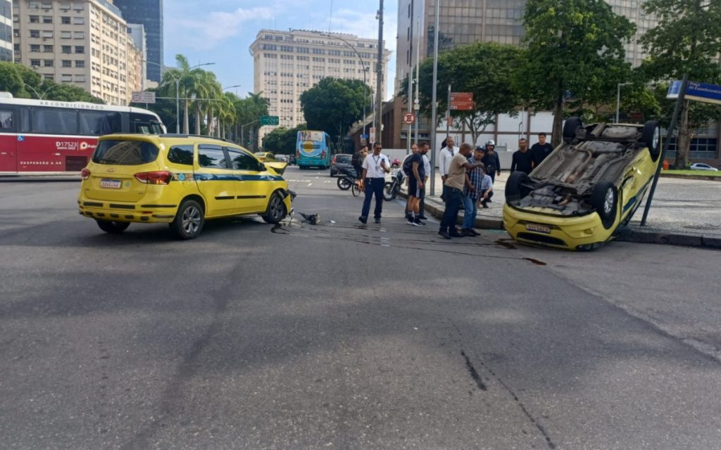 Um acidente envolvendo dois táxis, seguido de capotamento, interditou duas faixas da Avenida Presidente Antônio Carlos, na altura da Avenida Almirante Barroso, no Centro, na manhã desta quinta-feira (10).