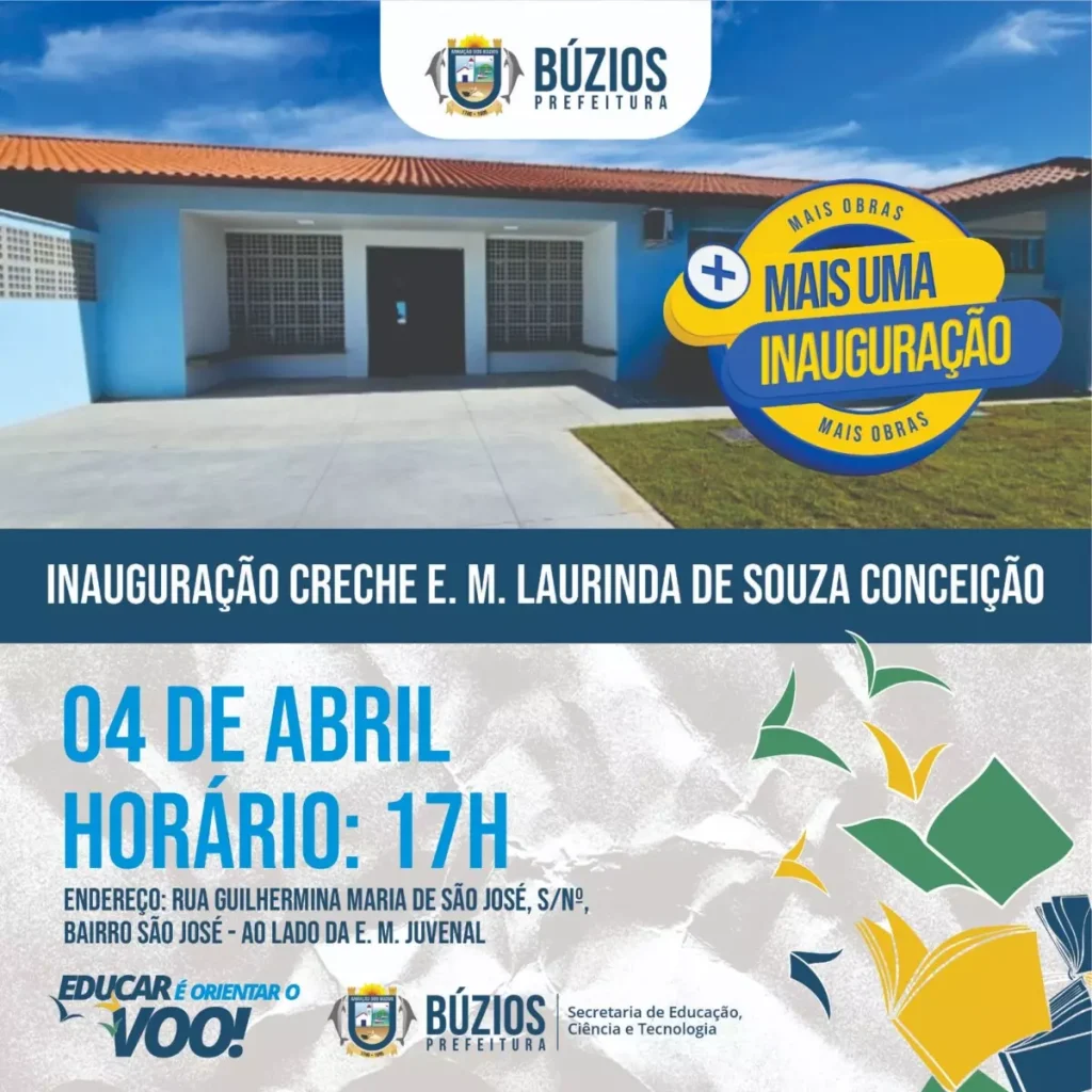 Búzios inaugura mais uma unidade de ensino, para crianças na faixa etária de 01 até 05 anos, nesta quinta-feira (04), às 17h, no bairro São José. A nova creche recebeu o nome de Laurinda de Souza Conceição, em homenagem à dona Laurinda (1945), carinhosamente conhecida como Linda, comerciante ativa no bairro São José, com o coração enorme, voltado a ajudar os mais necessitados.