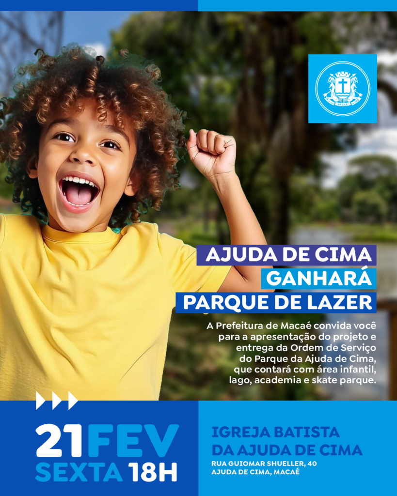 As obras para a melhoria da qualidade de vida da população não param em Macaé. Nesta sexta-feira, 21 de fevereiro de 2025, moradores da Ajuda de Cima e entorno poderão conhecer de perto os detalhes do projeto do Parque que será construído no bairro. A entrega da Ordem de Serviço (OS), que autoriza o início dos trabalhos, também será realizada na mesma oportunidade. O local, onde atualmente tem apenas um campo de futebol de barro, ganhará infraestrutura completa construída pela Prefeitura com gramado sintético, parquinho infantil, lago, academia e até skatepark.