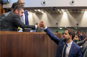 Thiago Pampolha cumprimenta e agradece ao presidente da Alerj, deputado Rodrigo Bacellar