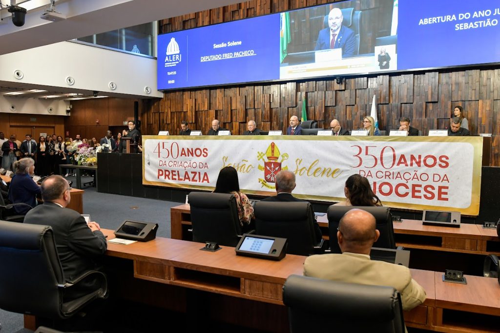 O plenário da Assembleia Legislativa do Estado do Rio de Janeiro (Alerj) foi palco, nesta segunda-feira (18/08), de importante comemoração pelos 350 anos da criação da Diocese do Rio de Janeiro. A celebração também lembrou os 450 anos da criação da Prelazia do Rio – circunscrição eclesiástica da Igreja Católica que abrange a cidade do Rio -, que ocorreu dez anos depois de sua fundação. A sessão solene faz parte das comemorações oficiais do Ano Jubilar da Arquidiocese de São Sebastião, iniciado em 19 de julho de 2025 e que se estenderá até 16 de novembro de 2026. Ao final, foi concedida à Arquidiocese uma Moção de Agradecimento pelo trabalho realizado.