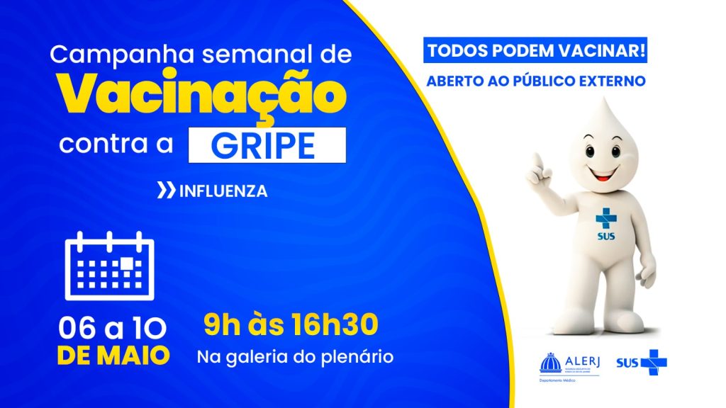 A Assembleia Legislativa do Estado do Rio de Janeiro (Alerj) deu início, nesta segunda-feira (06/05), à campanha de vacinação contra a gripe destinada aos servidores e também ao público em geral. A ação acontece até sexta-feira (10/05), na galeria do Edifício Lúcio Costa, das 9h às 16h30, e é preciso estar com o documento de Cadastro de Pessoa Física (CPF). A imunização abrange crianças (a partir de 9 anos de idade), jovens, idosos e funcionários da Casa.