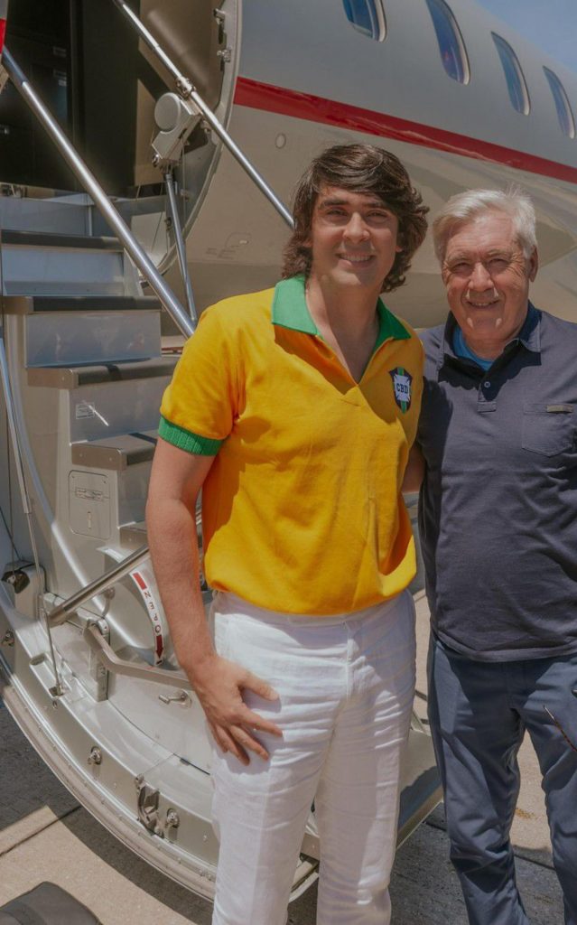 Antes de embarcar em um voo particular, Ancelotti posou para foto ao lado do empresário Diego Fernandes, intermediário nas negociações com a CBF. O agente usava uma camisa da seleção brasileira.