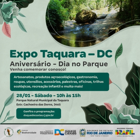 A Secretaria Municipal de Meio Ambiente e Proteção Animal de Duque de Caxias, através do Setor de Biodiversidade, realizará, neste sábado (28), no Parque Municipal da Taquara, uma programação em comemoração ao trigésimo aniversário do parque e um ano da existência do Projeto Dia no Parque, com uma edição especial.
