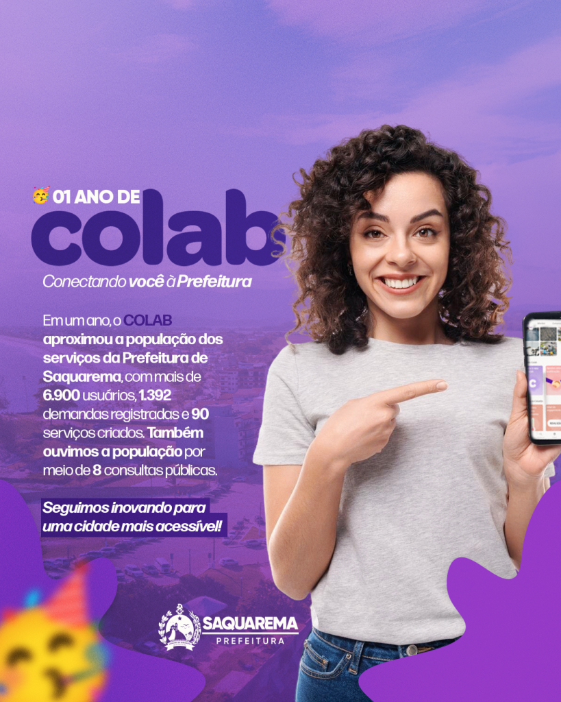 Pode-se dizer que, com o advento do COLAB, os saquaremenses passaram a ter o acesso direto à Prefeitura na palma da mão, de forma rápida e prática. Sem deslocamento, espera ou filas, resolver problemas ou usufruir de benefícios passou a ser bem mais fácil.