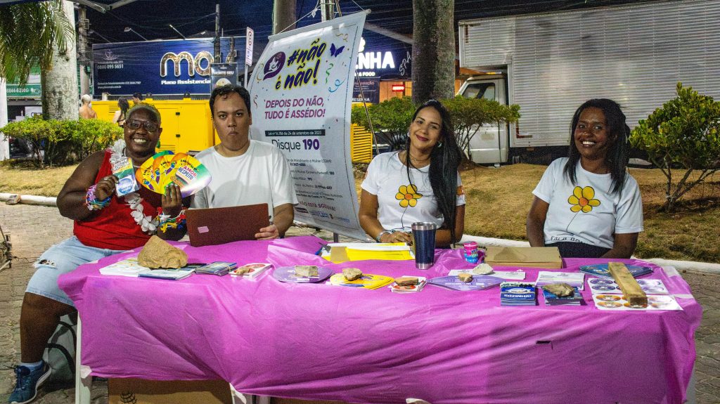 A diretora do Departamento de Direitos Humanos, Fernanda Costa, e a coordenadora do Centro Especializado de Atendimento à Mulher (CEAM Daiana Borges) promoveram uma abordagem noturna nos bares do centro da cidade para distribuição do material “NÃO É NÃO”. A campanha tem como objetivo prevenir casos de violência contra as mulheres e garantir atendimento humanizado a possíveis vítimas de constrangimento, importunação ou outros crimes. A coordenadora LGBTQIA+, Paula Azevedo, também distribuiu kit informativo.