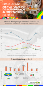 “Em 2025, o Brasil celebra duas conquistas históricas: a saída do Mapa da Fome e a redução da insegurança alimentar grave ao menor nível da série histórica do IBGE”, comemorou Wellington Dias, ministro do Desenvolvimento e Assistência Social, Família e Combate à Fome (MDS). “Levamos dois anos para reconquistar uma marca que, no passado, levou dez anos (2003-2013) de construção de políticas públicas para ser alcançada”, completou.