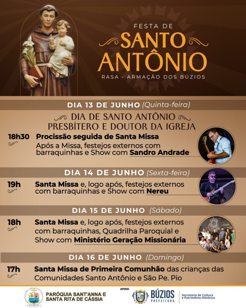A Paróquia Sant’Anna e Santa Rita de Cássia, com apoio da Prefeitura de Búzios, está realizando a tradicional Festa de Santo Antônio na Capela dedicada a ele no bairro da Rasa.