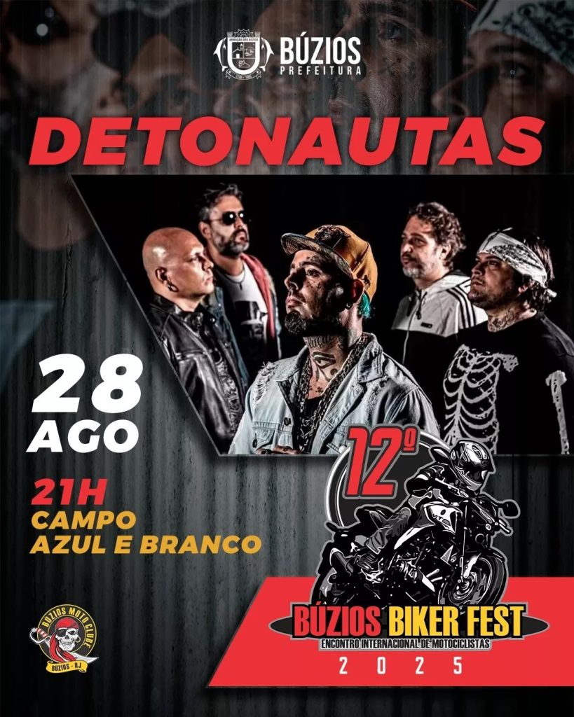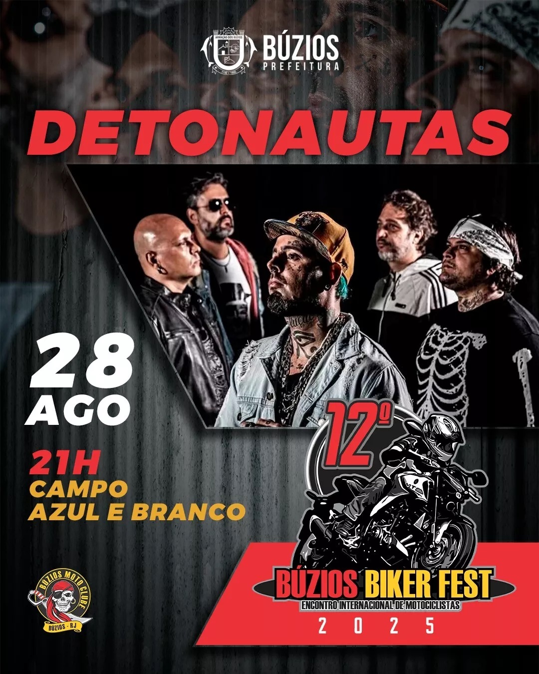 Búzios vai ser sede de mais um evento radical no dia 28 de agosto, quinta-feira, com o show da banda Detonautas. A apresentação integra a programação oficial do Búzios Biker Fest 2025, que acontece de 28 a 31 de agosto no Campo Azul e Branco, reunindo motociclistas, turistas e moradores em uma celebração de música, cultura e paixão sobre duas rodas.