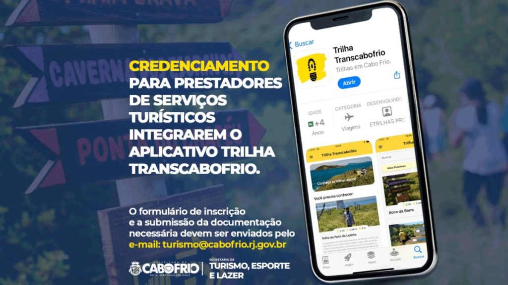 A Prefeitura de Cabo Frio está com credenciamento aberto para prestadores de serviços turísticos que estejam interessados em integrar o aplicativo Trilha TransCaboFrio. O formulário de inscrição e a submissão da documentação necessária devem ser enviados pelo e-mail turismo@cabofrio.rj.gov.br.