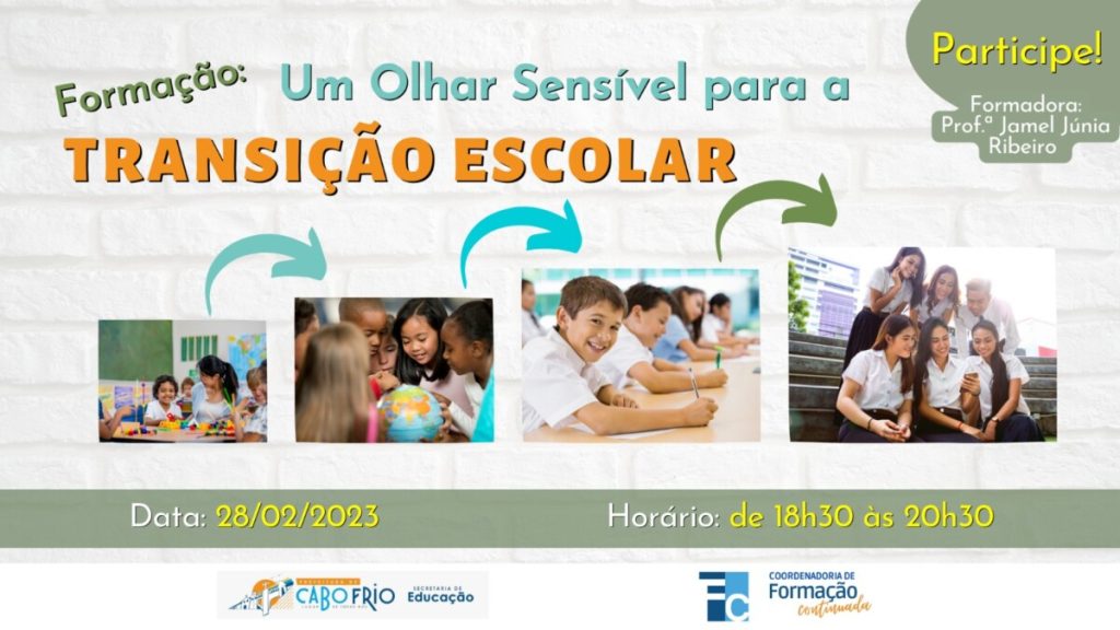 Estão abertas as inscrições para a formação “Um olhar sensível para a Transição Escolar”, promovida pela Secretaria Municipal de Educação de Cabo Frio, por meio da Coordenadoria de Formação Continuada. A atividade acontece nesta terça-feira (28), das 18h30 às 20h30, para professores regentes, professores das equipes de assessoramento pedagógico, auxiliares de classe, inspetores de alunos e membros das equipes diretivas.