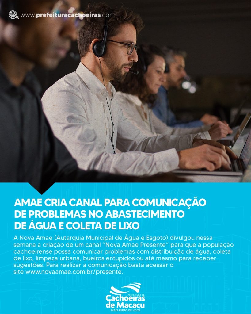 A Nova Amae (Autarquia Municipal de Água e Esgoto) divulgou nessa semana a criação de um canal “Nova Amae Presente” para que a população cachoeirense possa comunicar problemas com distribuição de água, coleta de lixo, limpeza urbana, bueiros entupidos ou até mesmo para receber sugestões. Para realizar a comunicação basta acessar o site www.novaamae.com.br/presente.