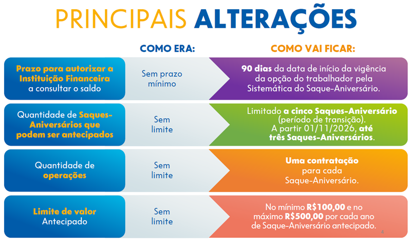 - A partir de 01/11/2026: limite de três saques-aniversário.
