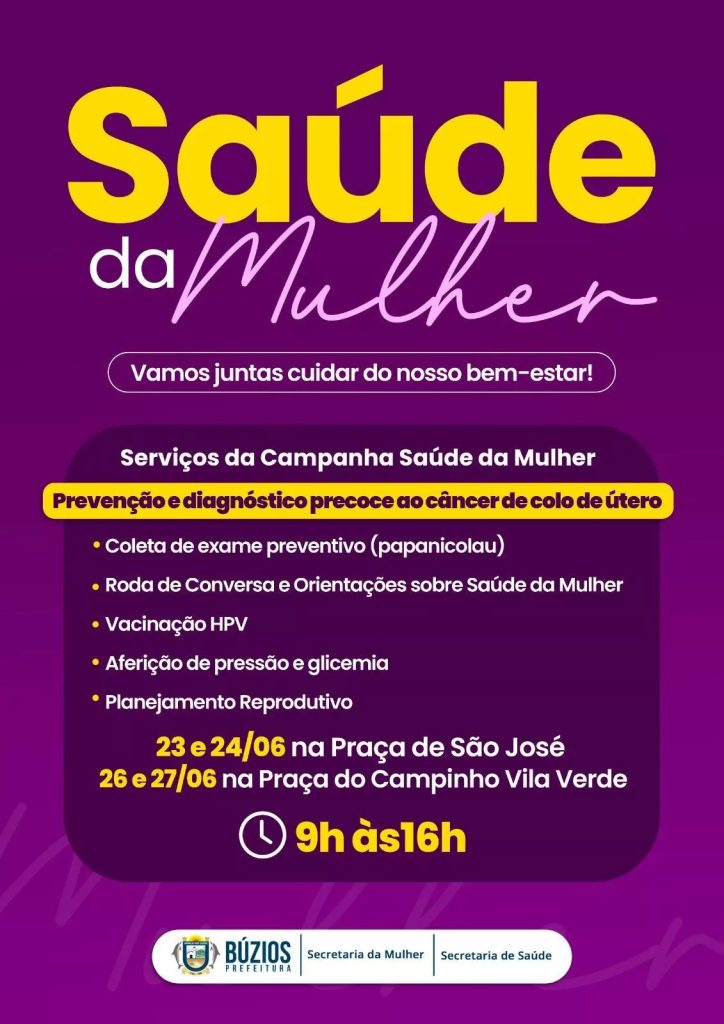 A Prefeitura de Búzios, por meio da Secretaria da Mulher, em parceria com a Secretaria Municipal de Saúde, dá continuidade à campanha “Saúde da Mulher”, nos dias 26 e 27 de junho, na Praça do Campinho, em Vila Verde. A ação acontece das 9h às 16h, com foco na promoção da saúde, prevenção de doenças e ampliação do acesso a serviços essenciais para o público feminino.