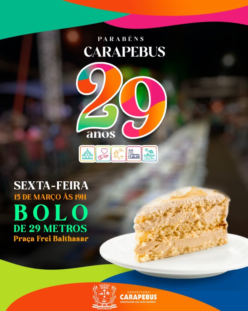 O município de Carapebus completa nesta quarta-feira (13), 29 anos de emancipação político-administrativa. E para celebrar a data, a prefeitura preparou uma programação para comemorar a data. Será no próximo final de semana, sexta-feira (15), sábado (16) e domingo (17), com shows na Praça Frei Balthasar, no Centro, e o tradicional bolo de 29 metros.