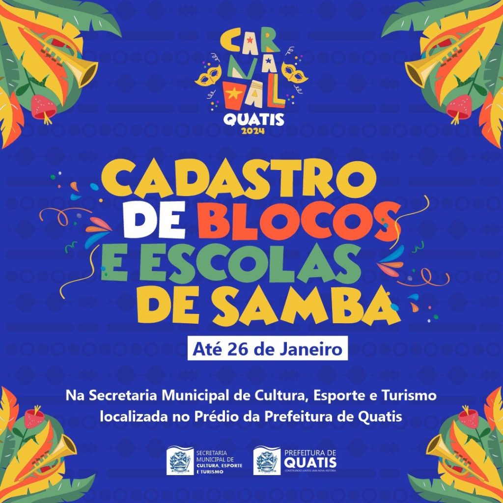Já está aberto, em Quatis, o período de cadastro para pôr os bloquinhos de rua que vão agitar o carnaval. A Prefeitura convocou nesta segunda-feira (22) os representantes dos blocos e escolas de samba para realizarem o Cadastro Cultural Carnavalesco, com o objetivo de dar apoio e autorização para o desfile em vias públicas do município, conforme leis e diretrizes de organização. As agremiações terão até esta sexta-feira, dia 26, para efetuar o cadastro.