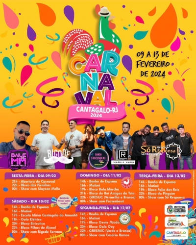 Em mais uma oportunidade Cantagalo será palco da maior festa de expressão popular, o Carnaval 2024. Serão 5 dias de festa, 10 blocos na avenida, banda de metais todos os dias, escolas de samba, banho de espuma, matinê, desfile de fantasias e todos os dias baile do sereno com excelentes shows dos mais variados estilos.