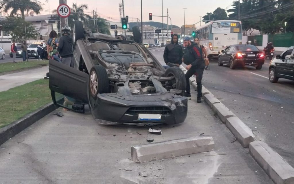 Carro capota em acidente com outro veículo e interdita pista do BRT na Zona Oeste
