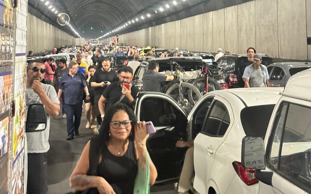 Em um vídeo divulgado nas redes sociais, é possível ver uma grande quantidade de veículos parados na via.