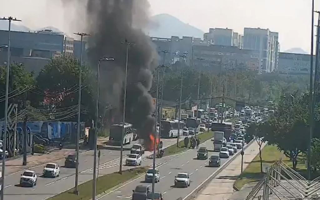 Um carro pegou fogo, na manhã desta segunda-feira (14), na Avenida Ayrton Senna, na altura do Via Parque, na Barra da Tijuca, na Zona Oeste.