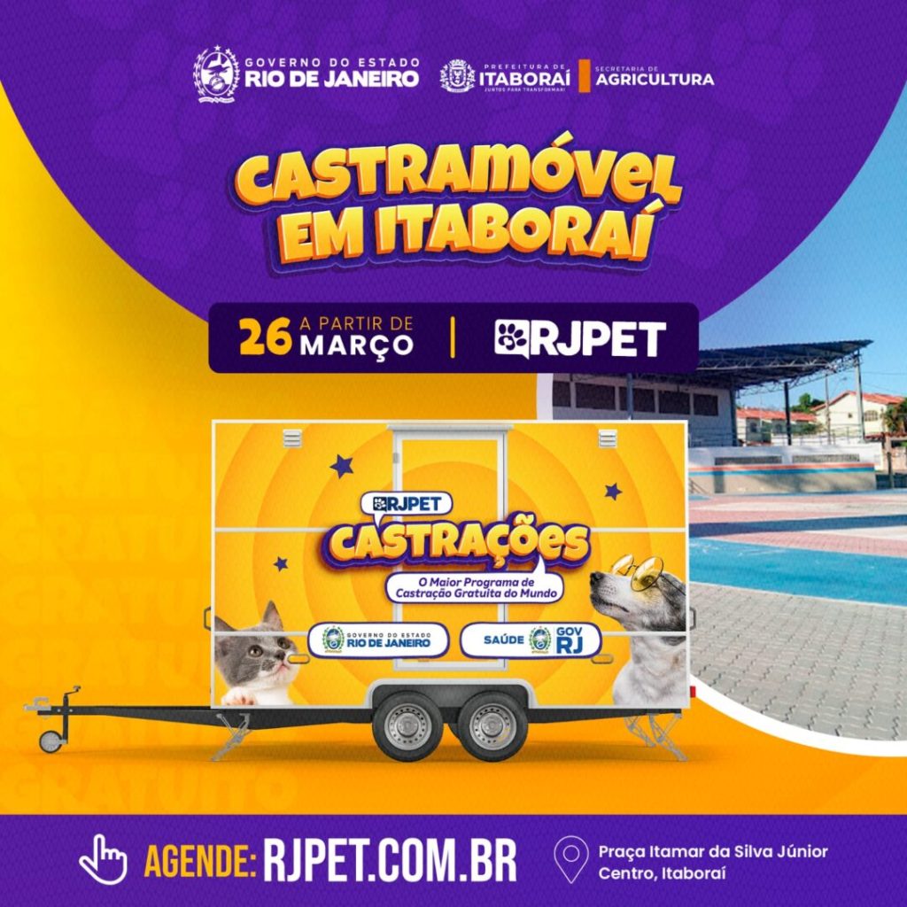 A partir da próxima terça-feira (26/03), o Castramóvel estacionará na Praça Itamar da Silva Júnior, no Centro de Itaboraí, para castrações gratuitas de cães e gatos. Para agendar o procedimento, é preciso acessar o site do RJPET (https://rjpet.com.br/). A iniciativa é promovida pelo Governo do Estado, por meio da Subsecretaria Estadual de Proteção e Bem-Estar Animal, e conta com apoio da Prefeitura de Itaboraí, por meio da Secretaria Municipal de Agricultura (Semagri).
