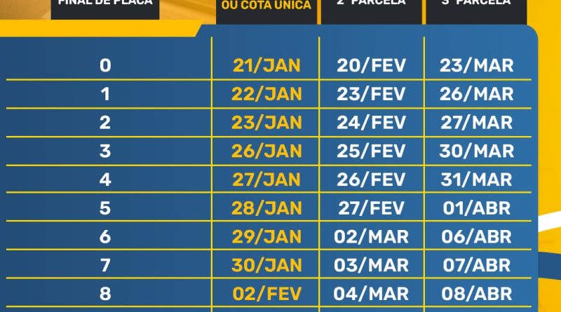 Read MoreDatas desta semana contemplam placas terminadas em 0, 1 e 2 O vencimento da primeira parcela, ou da cota única,