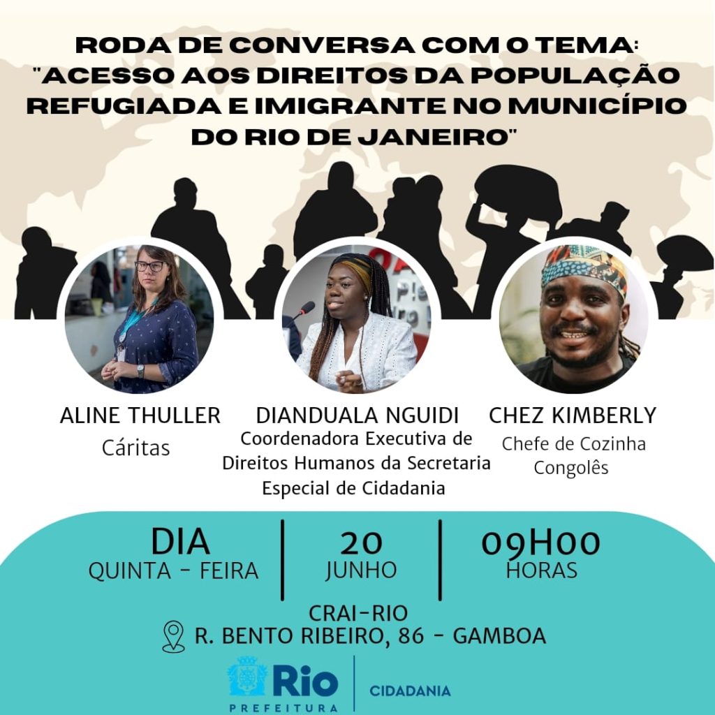 O Centro de Referência e Atendimento para Imigrantes (CRAI-Rio), sob a gestão da Secretaria Especial de Cidadania, promoverá a roda de conversa “Acesso aos direitos da população refugiada e imigrante no município do Rio de Janeiro”, em comemoração ao Dia do Refugiado, celebrado em 20 de junho. O debate, marcado para esta quinta-feira (20/06), contará com Aline Thuller, representante da organização Cáritas; Dianduala Nguidi, Coordenadora Executiva de Direitos Humanos da Secretaria Especial de Cidadania e de Chez Kimberly, chef de cozinha congolês.