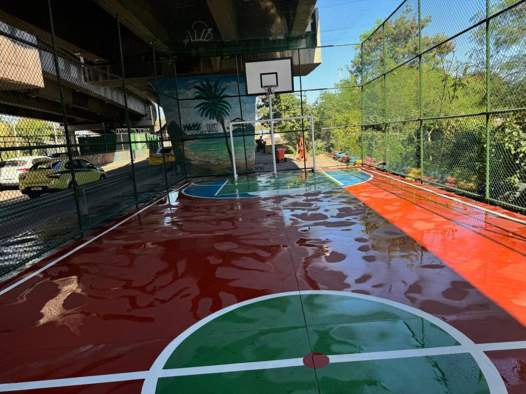 A quadra de esportes, com 25 metros de comprimento e sete de largura, recebeu piso em concreto com demarcação e pintura para a prática de futsal e basquete, além de equipamentos esportivos: duas tabelas e duas balizas. O espaço está protegido por defensas, com cobertura em tela de nylon e alambrado ao redor do piso elevado, além de iluminação especial em led.