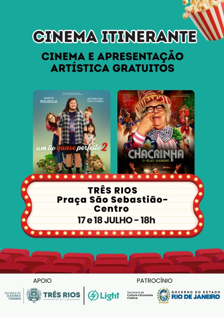 Na quinta (17) e sexta-feira (18), a partir das 18h, a exibição acontecerá na Praça São Sebastião. No primeiro dia o público irá assistir ao filme “Um tio quase perfeito 2” e no segundo dia o longa-metragem “Chacrinha – O velho guerreiro”.