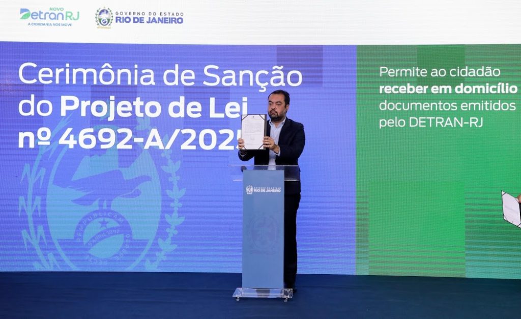 O governador Cláudio Castro sancionou nesta segunda-feira (05/05), a Lei 10.763/25, que autoriza o Detran RJ a entregar documentos em domicílio, e ampliou o serviço oferecendo a entrega gratuitamente. Com a assinatura realizada no Palácio Guanabara, a população fluminense poderá optar em receber em casa a Identidade Civil, a Carteira Nacional de Habilitação ou mesmo receber o Certificado de Registro e Licenciamento de Veículos (CRLV).