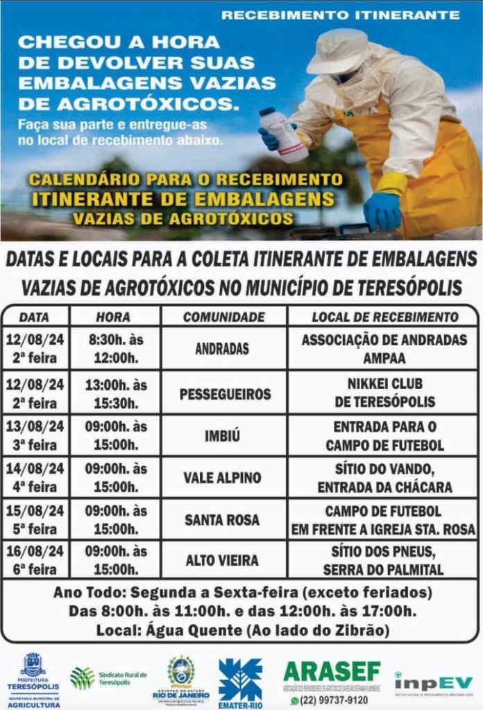 A Associação dos Revendedores de Agrotóxico da Região Serrana (ARASEF) está realizando a campanha para a coleta itinerante de embalagens vazias de agrotóxicos no interior do município. O objetivo é retirar do campo as embalagens de agrotóxico vazias e facilitar o acesso de produtores rurais à devolução.