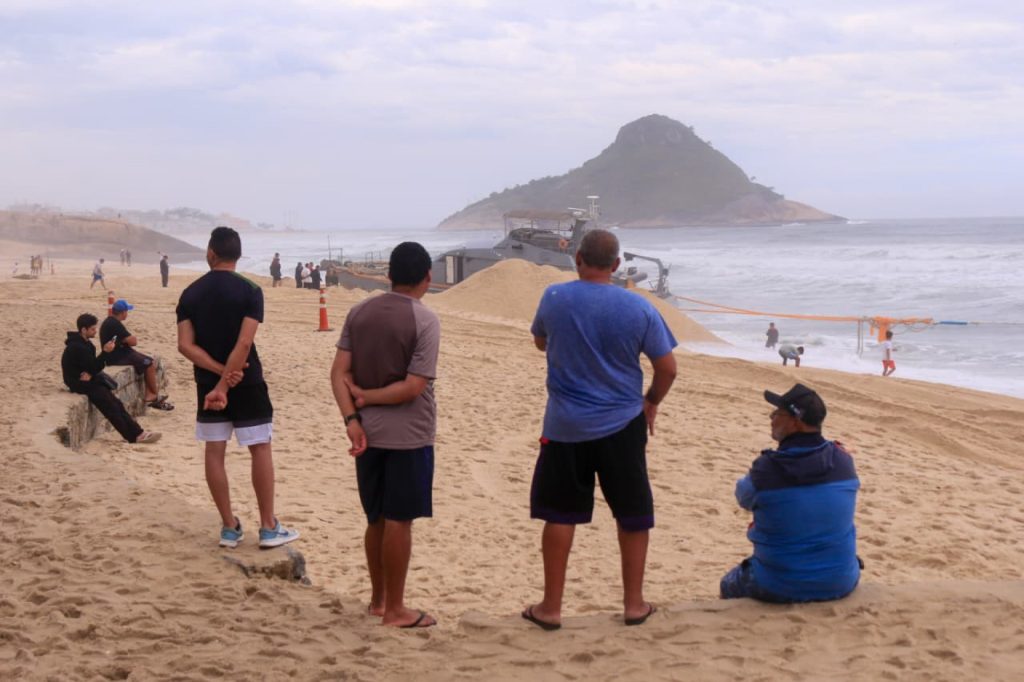 Curiosos acompanham, nesta quinta-feira (12), a operação de resgate para desencalhar o último barco da Marinha da Praia da Macumba, no Recreio dos Bandeirantes, na Zona Sudoeste. O Aviso de Patrulha “Marlim” ficou preso, na última terça-feira (10), ao tentar ajudar a Embarcação de Desembarque de Carga Geral (EDCG) “Guarapari”, que também encalhou, no dia anterior.