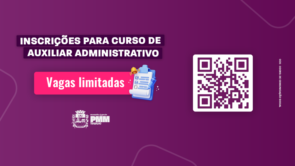 A Subsecretaria Municipal de Trabalho de Mesquita abriu novas vagas para o curso de Auxiliar Administrativo. As turmas são abertas a qualquer pessoa maior de 14 anos e com o Ensino Fundamental completo. As inscrições são realizadas pela internet, a partir do link https://docs.google.com/forms/d/e/1FAIpQLSfEBUpsY2axpHAS-jB7wBW8JznpsgNSXgTFgrdaQt-CjMyHXQ/viewform.