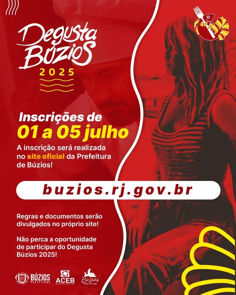 A Prefeitura de Búzios, por meio da Secretaria de Turismo e subsecretaria de Comunicação e Eventos, informa que estão abertas, entre os dias 1º e 5 de julho, as inscrições para o Degusta Búzios 2025, o maior festival gastronômico da Região dos Lagos. Os interessados devem se inscrever exclusivamente pelo site: buzios.rj.gov.br.