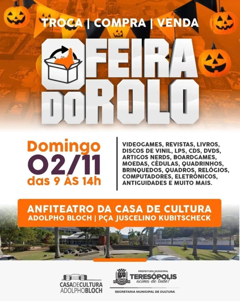 Halloween: Ponto de encontro de expositores e do público, a Feira do Rolo acontecerá das 9h às 14h, no anfiteatro da CCAB, com as mais variadas opções de artigos para troca, compra, venda e bons negócios. De produtos colecionáveis a peças de artistas e artesãos da região, eletroeletrônicos, ferramentas e utensílios em geral. Segundo os organizadores, o evento seguirá em clima de Halloween, com DJ para animar a galera, que é convidada a participar com sua fantasia preferida.