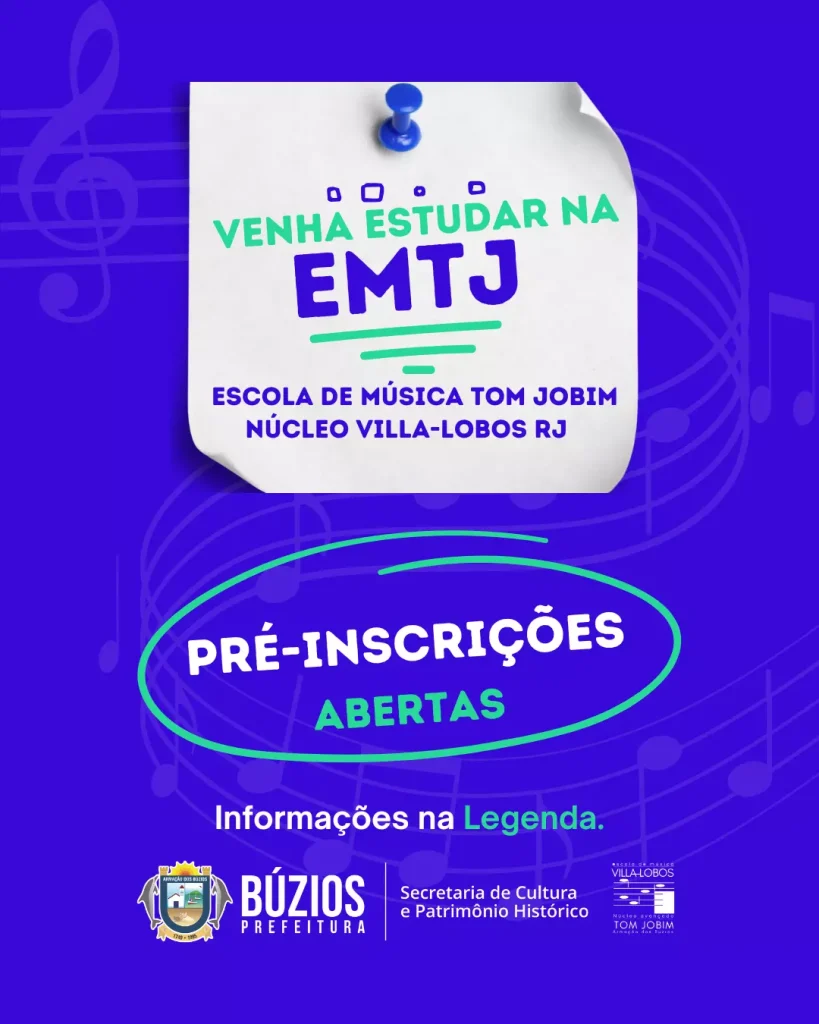 A Prefeitura de Armação dos Búzios, por meio da Secretaria de Cultura e Patrimônio Histórico, abriu nesta segunda-feira (02), a pré-inscrição para ingresso na Escola de Música Villa-Lobos | Núcleo Avançado Tom Jobim.