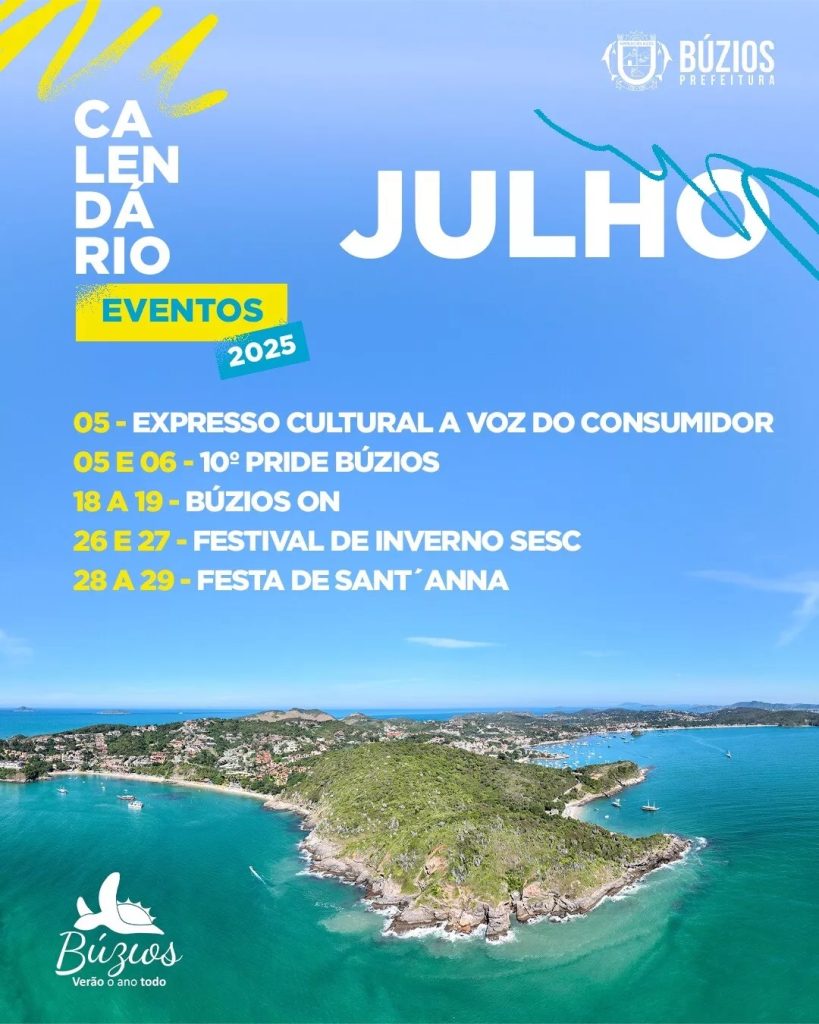 Mês de julho será repleto de atrações que prometem impulsionar o turismo e aquecer a economia local, em Búzios. A Prefeitura, por meio da Subsecretaria de Comunicação e Eventos programou vários eventos ao longo do mês, que inclui eventos culturais, LGBTQIA+, tecnológicos e religiosos, consolidando o balneário como um dos destinos mais completos e procurados do inverno brasileiro.