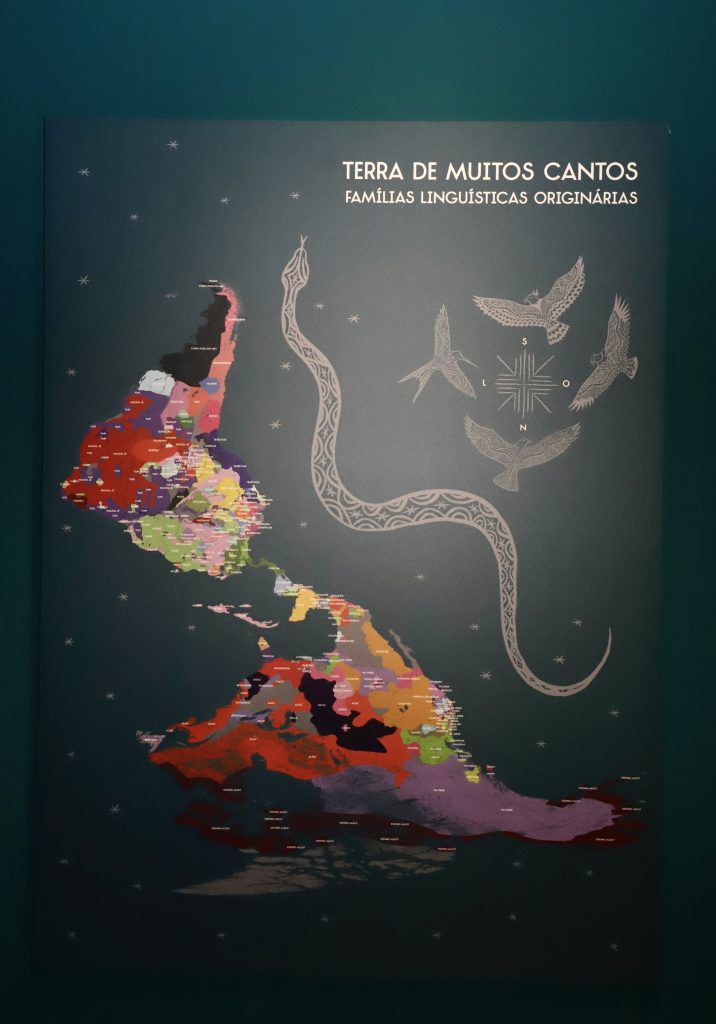 No espaço há ainda o mapa Terra de Muitos Cantos – famílias linguísticas originárias das Américas, que ilustra o continente americano de uma forma incomum, de cabeça para baixo. O mapa propõe outros olhares sobre o continente, os territórios originários e a diversidade de povos e línguas indígenas. Baseado nos poucos materiais existentes sobre o tema, ele mostra de forma simplificada e aproximativa a distribuição geográfica das famílias linguísticas.
