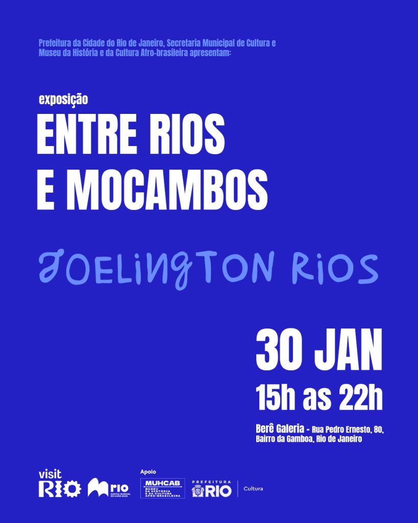 A Galeria Berê, novo espaço de arte localizado no Museu de História e Cultura Afro-Brasileira (MUHCAB), inaugura no dia 30 de janeiro a exposição “Entre Rios e Mocambos”. É a primeira mostra individual do artista quilombola Joelington Rios na capital fluminense. A exposição apresenta um conjunto de obras que constroem uma travessia sensível entre territórios conectados pela memória, pela ancestralidade e pelas formas coletivas de existir e resistir. A curadoria é assinada por Marcelo Campos e Bruno Oliveira.