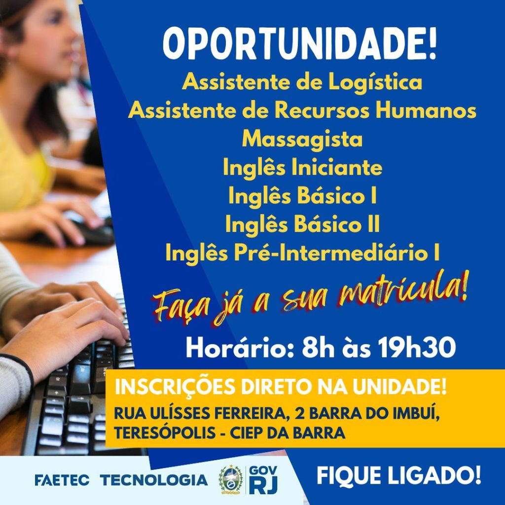 A Faetec Teresópolis está com matrículas abertas para os cursos de Assistente de Logística (20 vagas), Assistente de Recursos Humanos (20 vagas), Massagista (18 vagas) e Inglês Iniciante, Básico I e II e Pré-intermediário (25 vagas), totalizando 83 oportunidades de capacitação profissional.