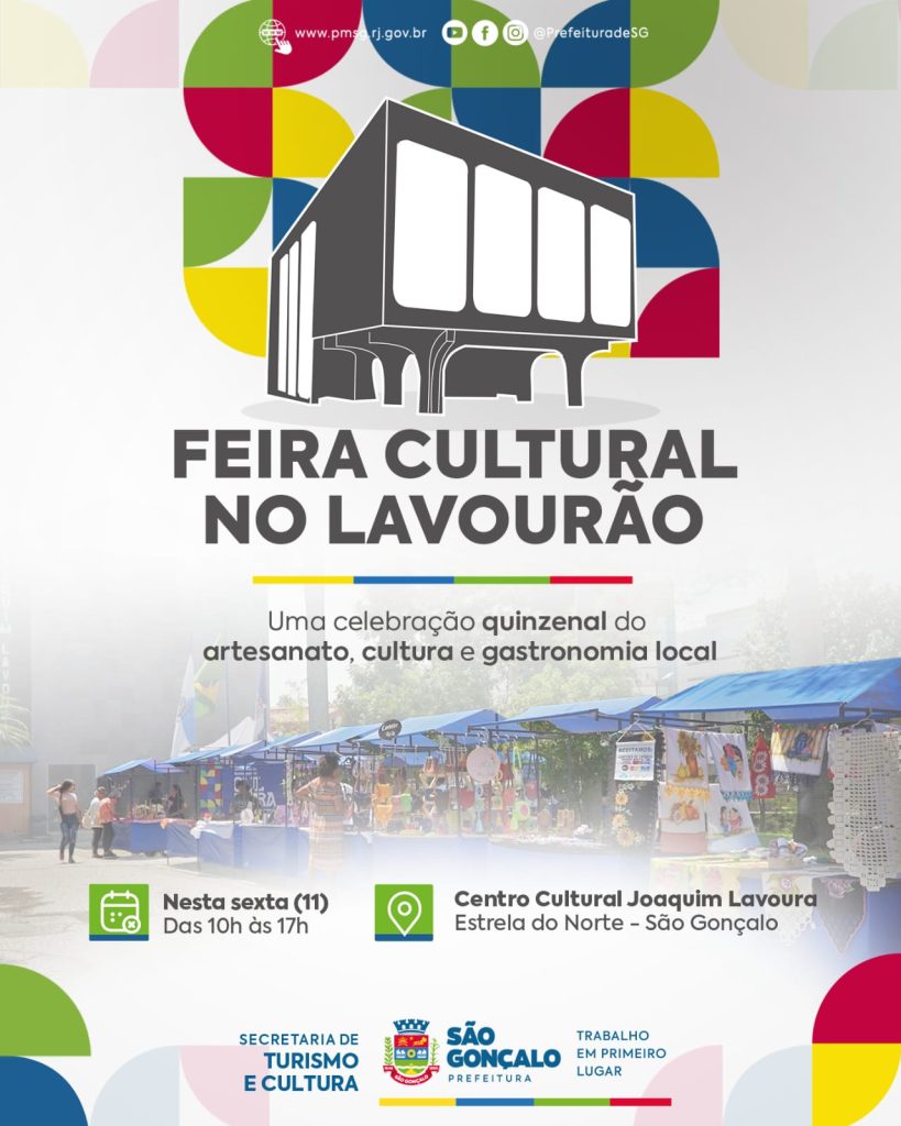 A Secretaria de Turismo e Cultura da Prefeitura de São Gonçalo promove, nesta sexta-feira (11), no Centro Cultural Joaquim Lavoura, o Lavourão, a já tradicional Feira da Cultura. Com uma programação diversificada, o evento reúne o melhor do artesanato, da gastronomia e da arte, ao mesmo tempo em que promove ações sociais e fomenta o apoio à economia comunitária.