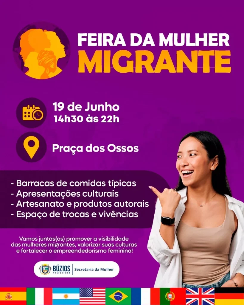 A Prefeitura de Búzios por meio da Secretaria da Mulher, convida a população para participar da Feira da Mulher Migrante, que será realizada nesta quinta-feira (19/06), na Praça dos Ossos, com uma programação especial voltada à valorização das culturas, saberes e histórias que atravessam fronteiras.