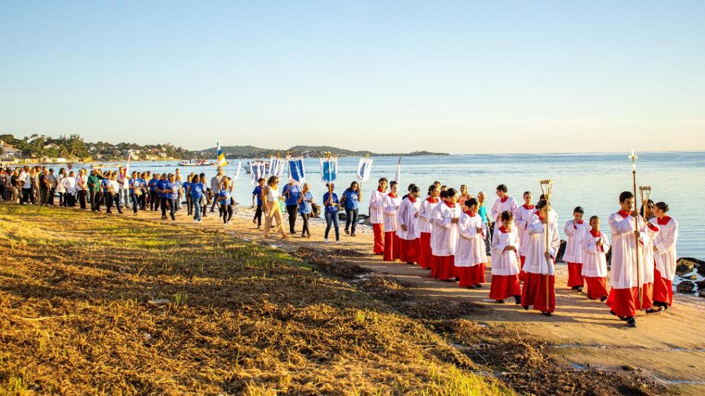 Iraci Cardoso, moradora de São Pedro da Aldeia por mais de 30 anos, acompanhou a procissão terrestre pela primeira vez desde que se mudou para o Rio de Janeiro. Ela levou o filho, Anderson Cardoso, e a nora, Karollyne Martins, que não resistiram e mergulharam na tradição, só que com o trajeto marítimo. “O meu coração está transbordando de alegria de rever tantas amizades, de reviver esse momento tão maravilhoso. Antes, a gente tinha a Praineira, que vinha de Cabo Frio, e nós íamos com a Orquestra e todo o coral que nós tínhamos na Igreja da Matriz. Hoje, a gente vê a continuidade da nossa fé, do nosso testemunho de amor por Deus através de São Pedro. Esse lugar tão maravilhoso que é um paraíso, não só pela igreja, mas também pela recepção das pessoas que aqui moram, com ambiente de empatia”, destacou Iraci, emocionada.