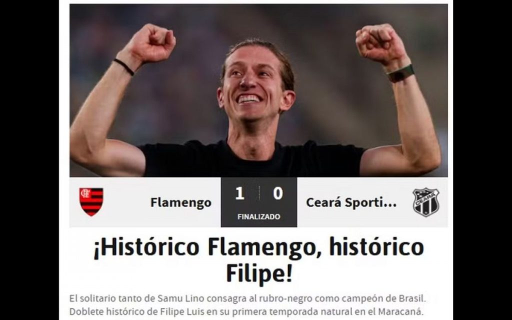 “Filipe Luís faz história! O Flamengo encerra o ano com uma dobradinha inédita na segunda temporada do treinador no Maracanã. O gol solitário de Samu Lino no primeiro tempo garantiu o título do Campeonato Brasileiro para o time rubro-negro. Filipe se consolidou como o técnico mais cobiçado do continente. Em apenas 14 meses, conquistou tudo, tanto nacional quanto internacionalmente, com a Copa Libertadores sendo a cereja do bolo conquistada há poucos dias”, escreveu o diário.