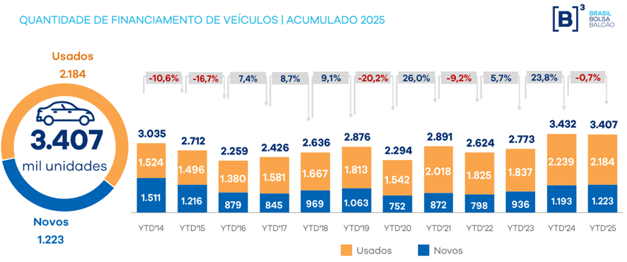 As vendas financiadas de veículos no Brasil totalizaram 3,4 milhões de unidades no primeiro semestre de 2025, entre novos e usados, de acordo com dados da B3. O número, que inclui autos leves, pesados e motos em todo o país, representa uma redução de 0,7% na comparação com o mesmo período do ano passado. Em valor absoluto, foram 24 mil unidades financiadas a menos.