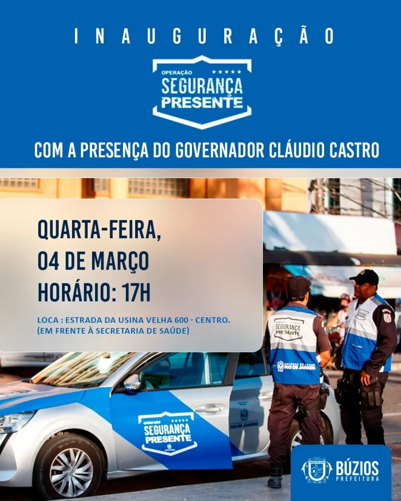 Nesta quarta-feira (04), o governador Claudio Castro e o prefeito Alexandre Martins inauguram, às 17h, o Programa Segurança Presente, ao lado da sede da Prefeitura, reforçando o compromisso conjunto com a ampliação da segurança pública no município de Búzios.